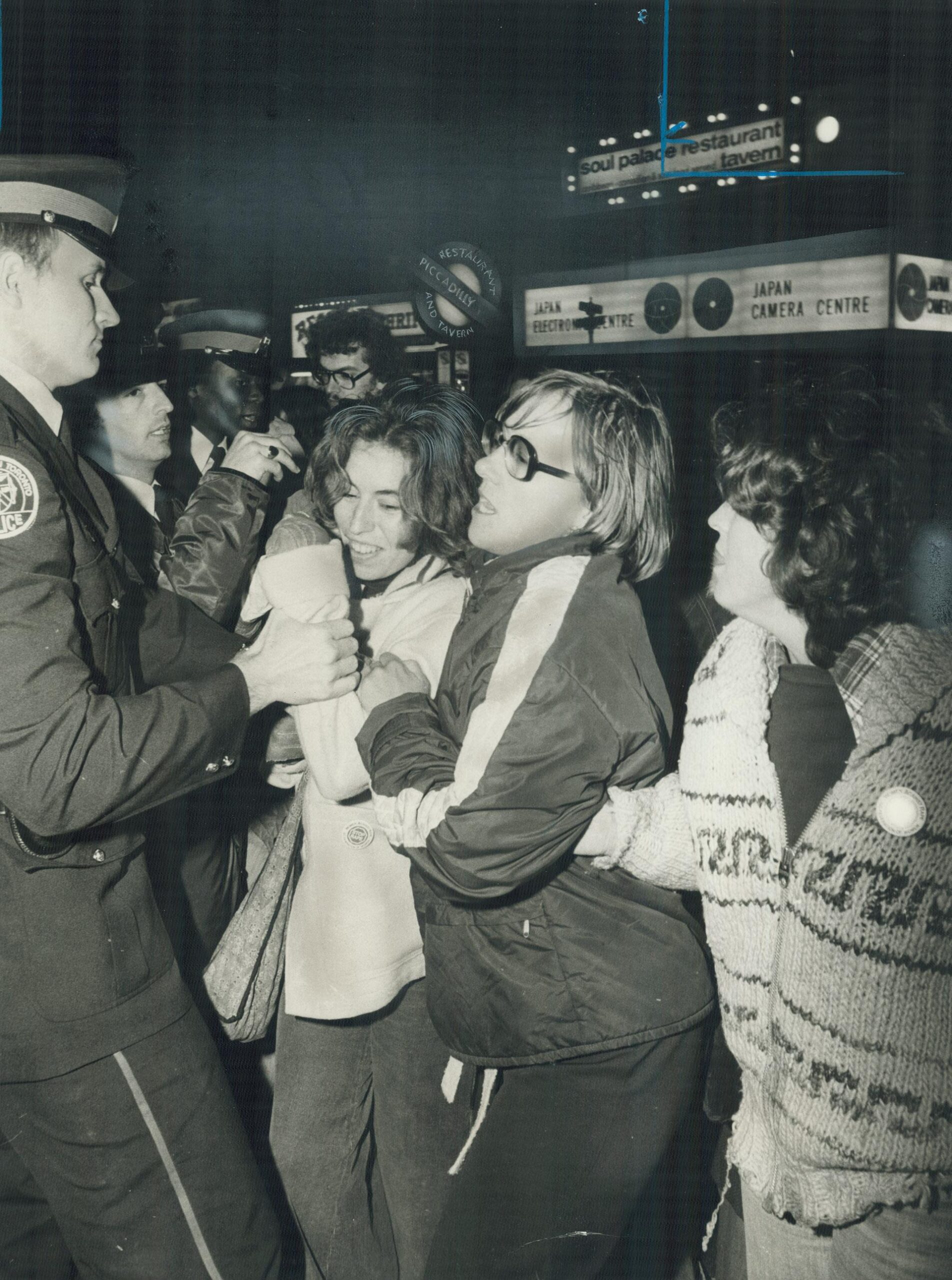 Photograph Credit: Mahler, John. Cinema storm, Metro police grapple with women trying to invade Cinema 2000 on Yonge St. Toronto Star, pg A1. November 6, 1977